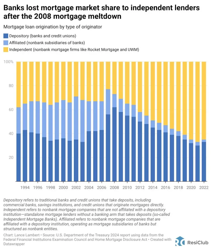 Since the 2008 housing bust and subsequent Great Financial Crisis (GFC), mortgage lending has steadily shifted away from big banks. In the years that followed—amid tighter regulations, higher capital requirements, and elevated litigation risk—many large banks, including Bank of America, JPMorgan Chase, and Wells Fargo, reduced their mortgage footprint. In that void, nonbank lenders, also known as independent mortgage banks (IMBs), such as Rocket Mortgage, United Wholesale Mortgage (UWM), and loanDepot, gained market share.