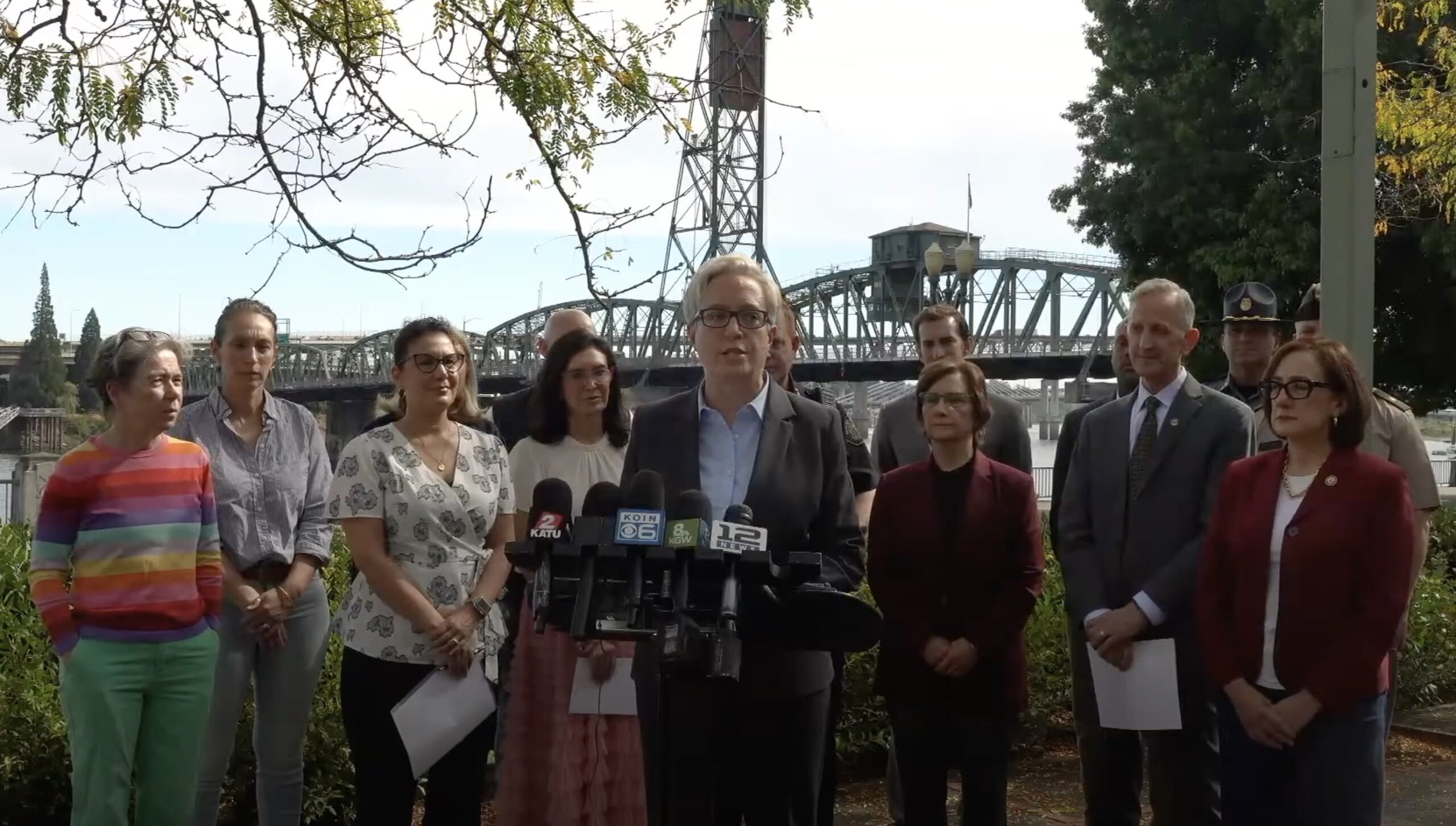 Oregon Governor Tina Kotek flanked by state and local officials in Portland, delivering a defiant press conference rejecting President Trump’s plan to deploy federal troops to the city.