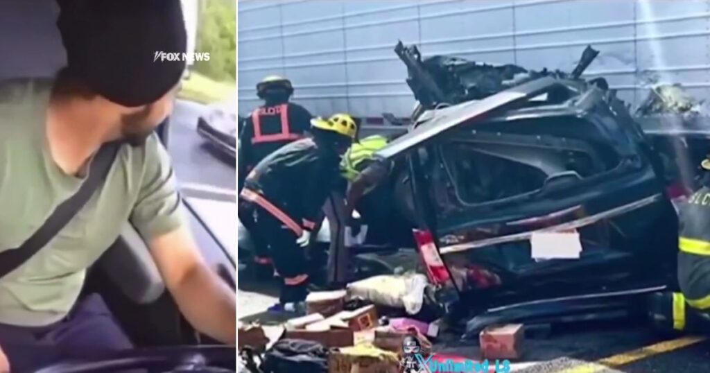 A truck driver recognized as Harjinder Singh, left, turns left in entrance of visitors, however a black minivan, proper, was unable to cease and smashed into the trailer. (@FoxNews / X display shot; @unlimited_ls / X display shot)