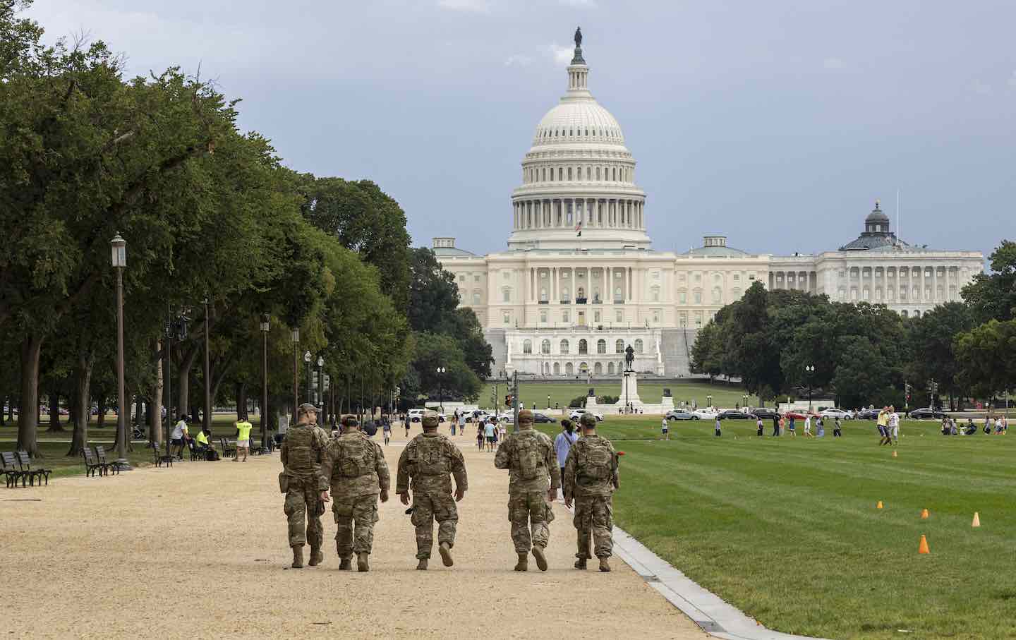 Members of the Nationwide Guard stroll on the Nationwide Mall on August 14, 2025, in Washington, DC, following President Donald Trump’s deployment of federal forces and takeover of town’s police division.