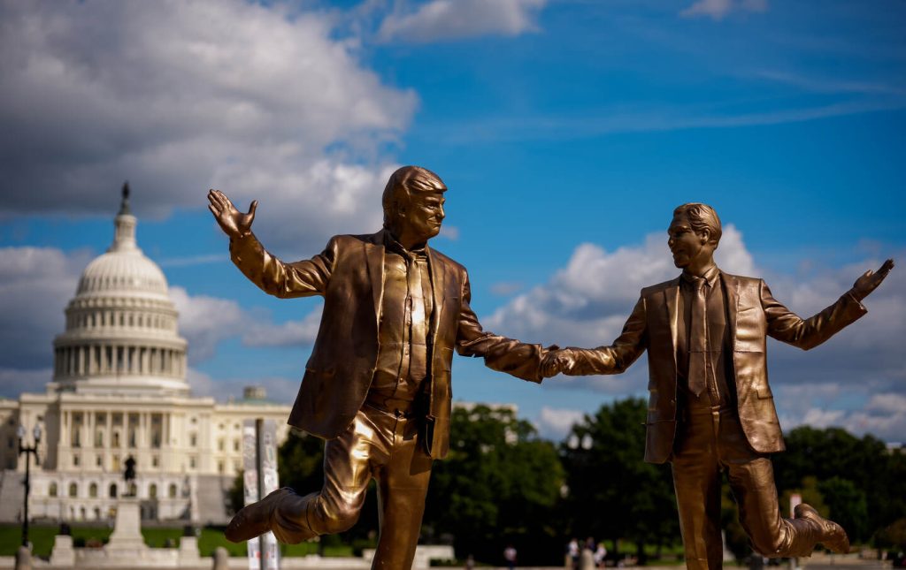 A bronze-painted statue titled “Best Friends Forever”, depicting Donald Trump and Jeffrey Epstein holding hands on October 2, 2025, in Washington, DC.