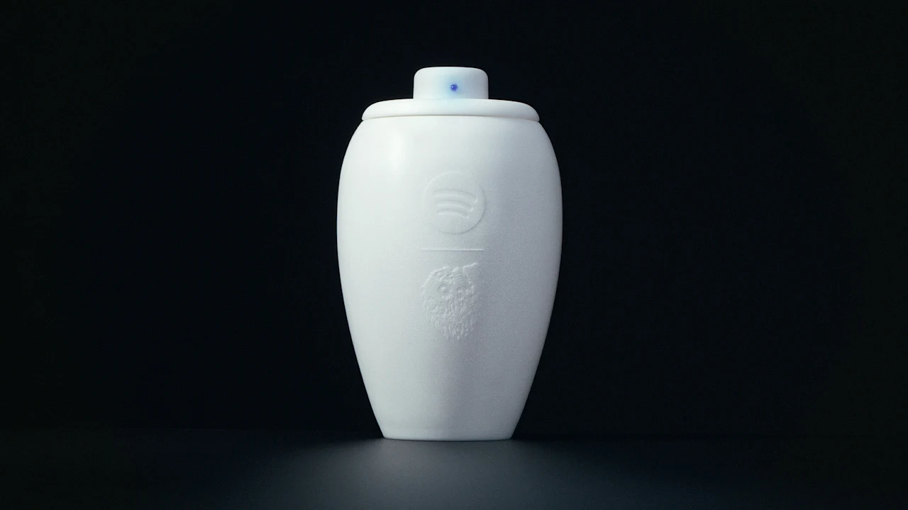 The tasteful white urn has a top outfitted with a Bluetooth speaker. Spotify is also introducing the “Eternal Playlist Generator” in the U.S., where you can answer a few questions and prompts to generate a personalized mix for your ashes to enjoy for all of eternity. Liquid Death is producing a few hundred of the urns, which will sell on its site for $495.