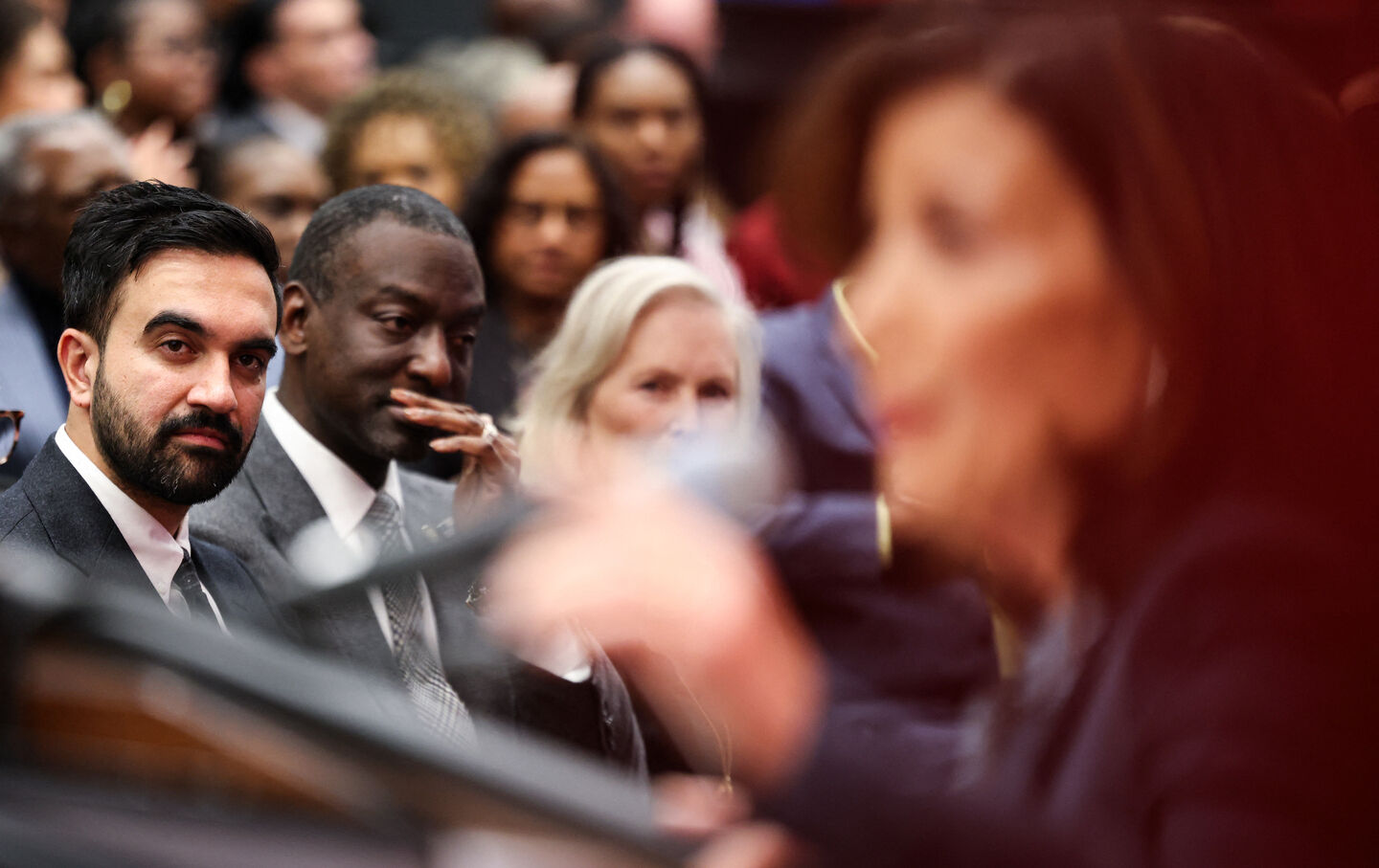New York City Mayor-elect Zohran Mamdani looks on as New York Governor Kathy Hochul speaks during the grand opening of the Urban League Empowerment Center in Harlem, New York City, on November 12, 2025.