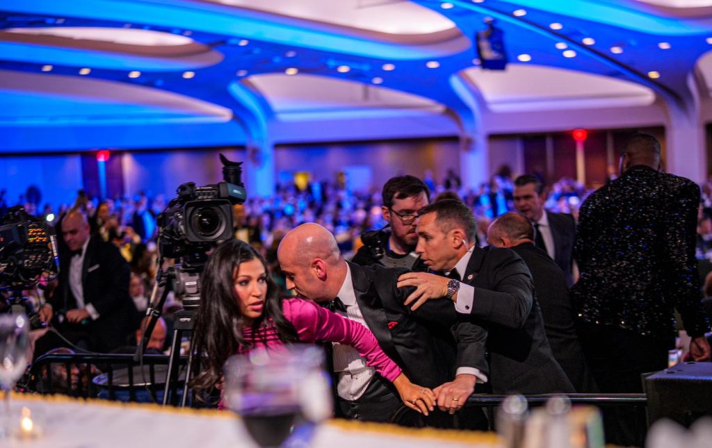 White House deputy chief of staff for policy Stephen Miller and his wife, Katie Miller, are taken out of the ballroom by security agents during a shooting incident at the annual White House Correspondents Association Dinner at the Washington Hilton on April 25, 2026, in Washington, DC.