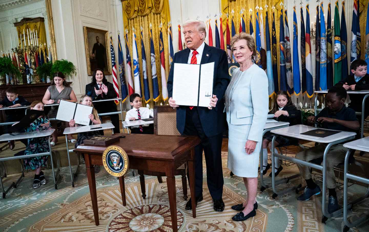 President Trump poses with Secretary of Education Linda McMahon after signing an executive order aimed at closing the Education Department.