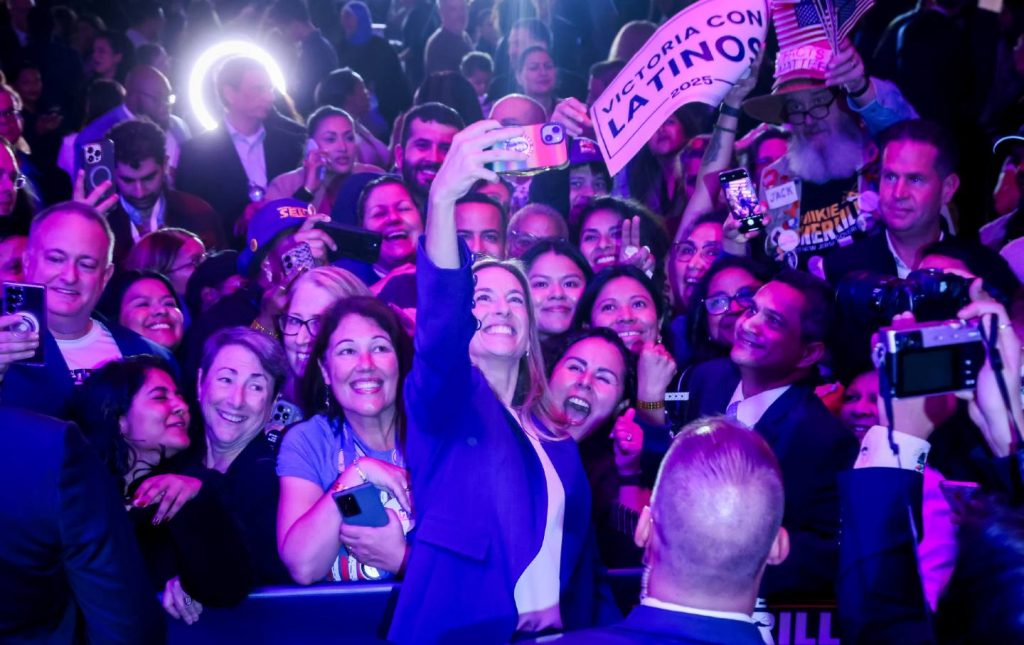 Mikie Sherrill, the Democratic governor-elect of New Jersey, takes a photo with attendees on election night in East Brunswick, New Jersey, on November 4, 2025.