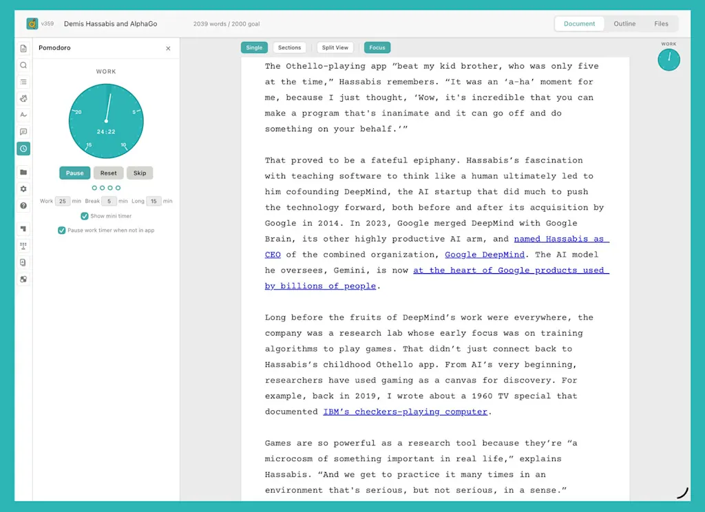 Microsoft and Google are never going to design a word processor for that specific scenario. But it turned out that it wasn’t all that hard. Doolee Write documents support bundled extras such as text files, PDFs, and audio recordings. There’s a built-in outliner that excels at wrangling documents made up of many small chunks, such as my recent oral history of Apple’s earliest years. I find the Pomodoro time management system—which I learned about in a 2015 Fast Company article—invaluable for keeping me focused, so I built it in. My functionality for embedding links and copying text as HTML are much nicer than those in any off-the-shelf package I know.